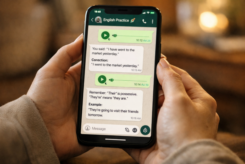هيجيلك تدريبات منتظمة على واتساب عشان تقوي الكتابة والتعبير، ومع كل مهمة هتعرف أخطائك وتتعلم إزاي تطورها.
